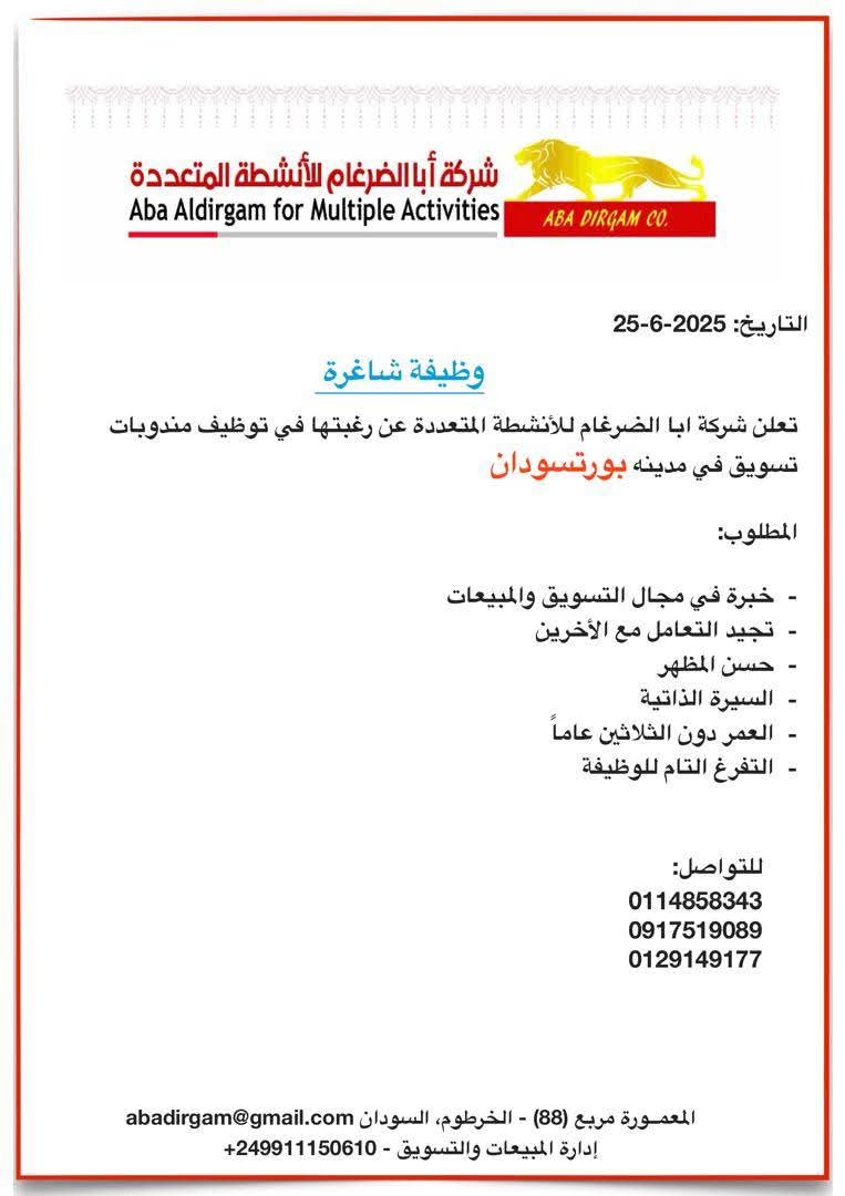 شركة آبا الضرغام تعلن عن وظائف لمندوبات تسويق في بورتسودان