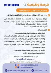 إذا كنت مهندسًا ميكانيكيًا تمتلك هذه المهارات والخبرات، وتبحث عن فرصة للانضمام إلى شركة رائدة في قطاع المقاولات، فإن شركة عبدالله عايد العنزي للمقاولات العامة تدعوك للانضمام إلى فريقها. للتقديم، يرجى إرسال سيرتك الذاتية إلى البريد الإلكتروني: jobs@rrksa.com. يرجى التأكد من كتابة مسمى الوظيفة ومنطقة السكن في عنوان البريد الإلكتروني لتسهيل عملية الفرز.