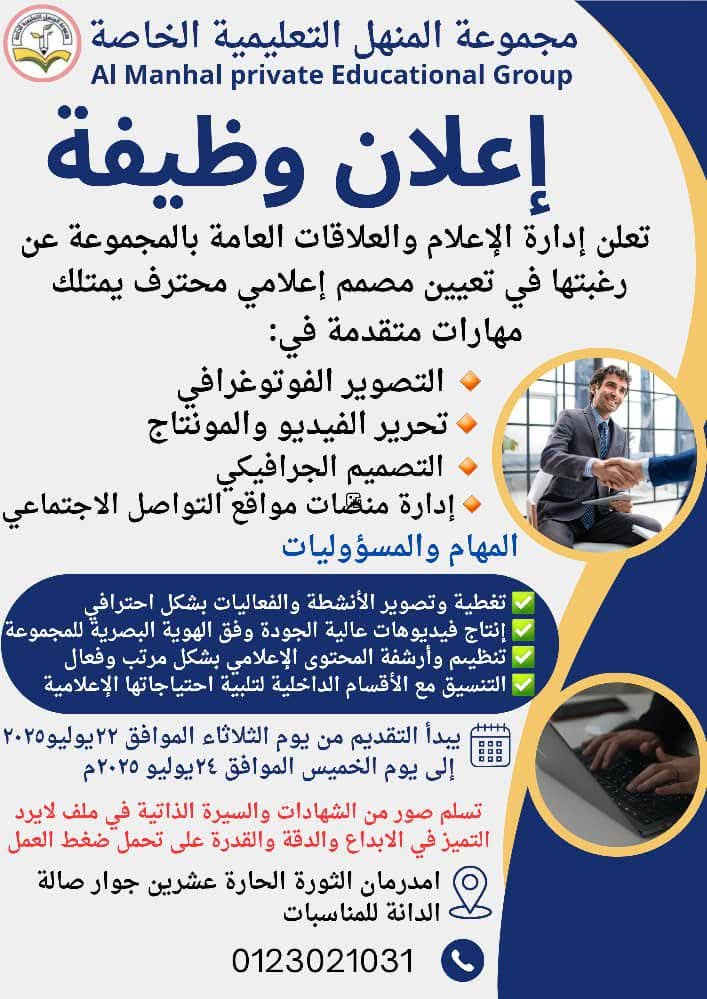 فرصة عمل من قلب مدينة امدرمان: مجموعة المنهل التعليمية الخاصة تبحث عن مصمم محترف