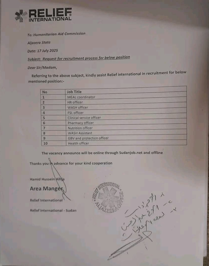 الجزيرة _ الإداري _ منظمات ، في ظل تزايد الحاجة للكوادر المؤهلة في مجال العمل الإنساني، أعلنت منظمة الإغاثة العالمية (Relief International) عن توفر عدد من الوظائف الجديدة بولاية الجزيرة، وذلك بالتنسيق مع مفوضية العون الإنساني بالولاية.
