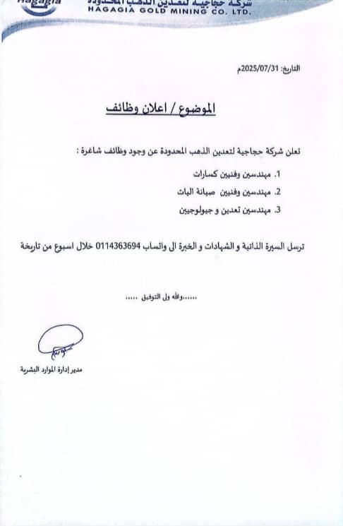 تعلن شركة حجاجية لتعدين الذهب المحدودة عن فتح باب التقديم لوظائف شاغرة تشمل ثلاثة مجالات محورية داخل عملياتها الإنتاجية، وهي: