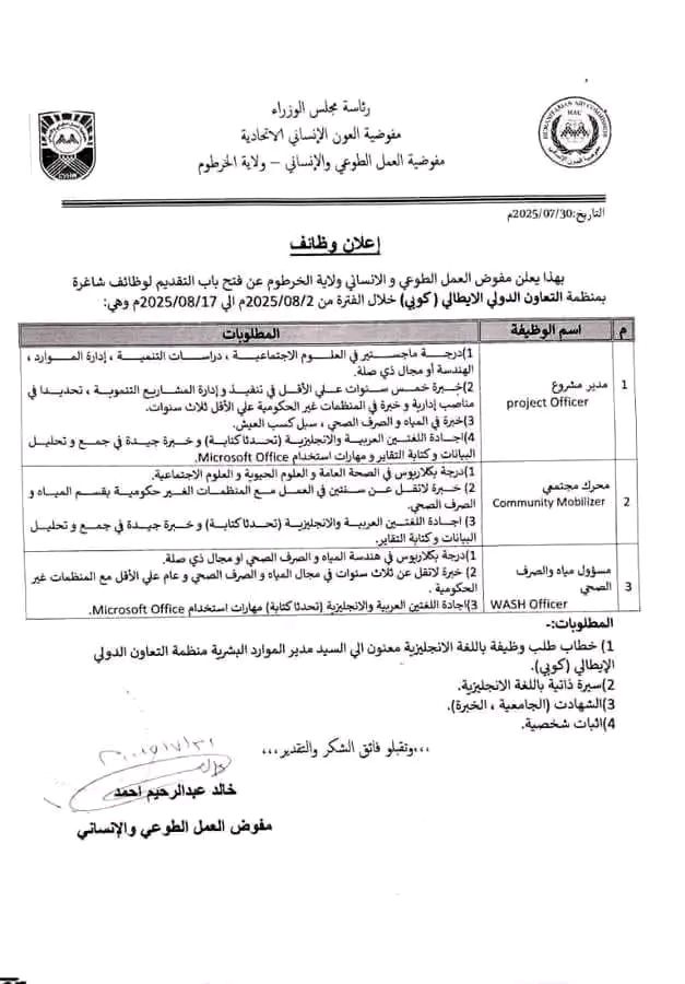 فرص عمل في مجالات إدارة المشاريع، العمل المجتمعي، والمياه والصرف الصحي بولاية الخرطوم – التقديم مفتوح حتى 17 أغسطس 2025