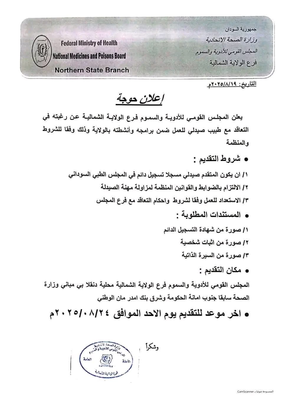 الشمالية _ الطبي _ الحكومي ، يعلن المجلس القومي للأدوية والسموم – فرع الولاية الشمالية عن رغبته في التعاقد مع طبيب صيدلي للعمل ضمن برامجه وأنشطته داخل الولاية، وذلك وفقًا للشروط المحددة.