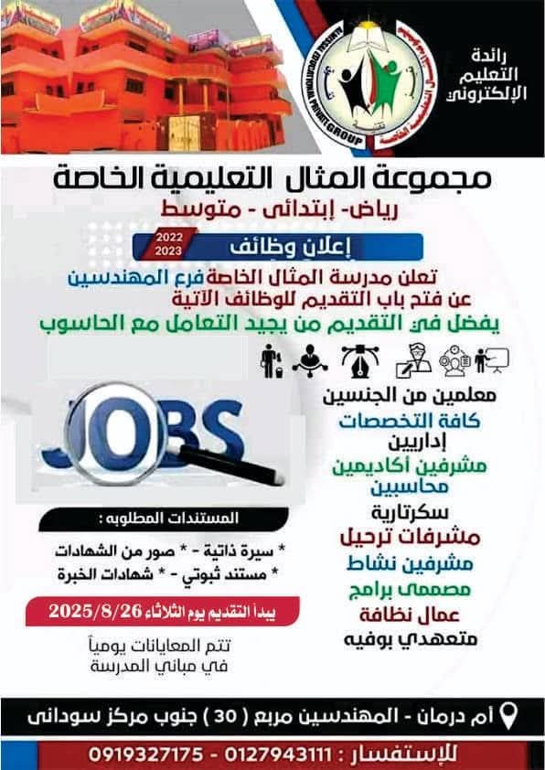 الخرطوم _ التعليم _ الخاص ، تعلن مدرسة المثال فرع المهندسين عن فتح باب التقديم للوظائف التالية: