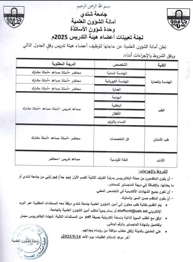 تفاصيل التقديم: تُستقبل طلبات التعيين لدى أمين الشؤون العلمية بجامعة شندي أو عبر البريد الإلكتروني (staffunit@ush.sd) مرفقة بجميع المستندات المطلوبة بصيغة PDF. آخر موعد للتقديم يوم الأحد 14/9/2025.