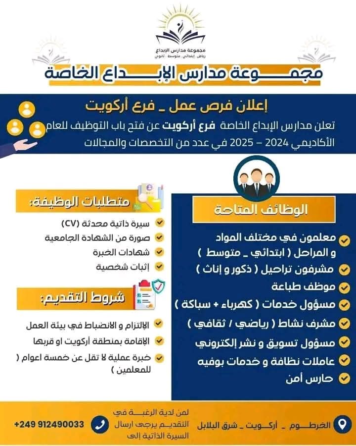الخرطوم _ التعليم _ الخاص ، أعلنت مجموعة مدارس الإبداع الخاصة فرع أركويت عن فتح باب التوظيف للعام الأكاديمي 2024 – 2025، وذلك في عدد من التخصصات والمجالات التعليمية والإدارية، بهدف دعم العملية التعليمية وتوفير بيئة متكاملة تلبي احتياجات الطلاب وأولياء الأمور.