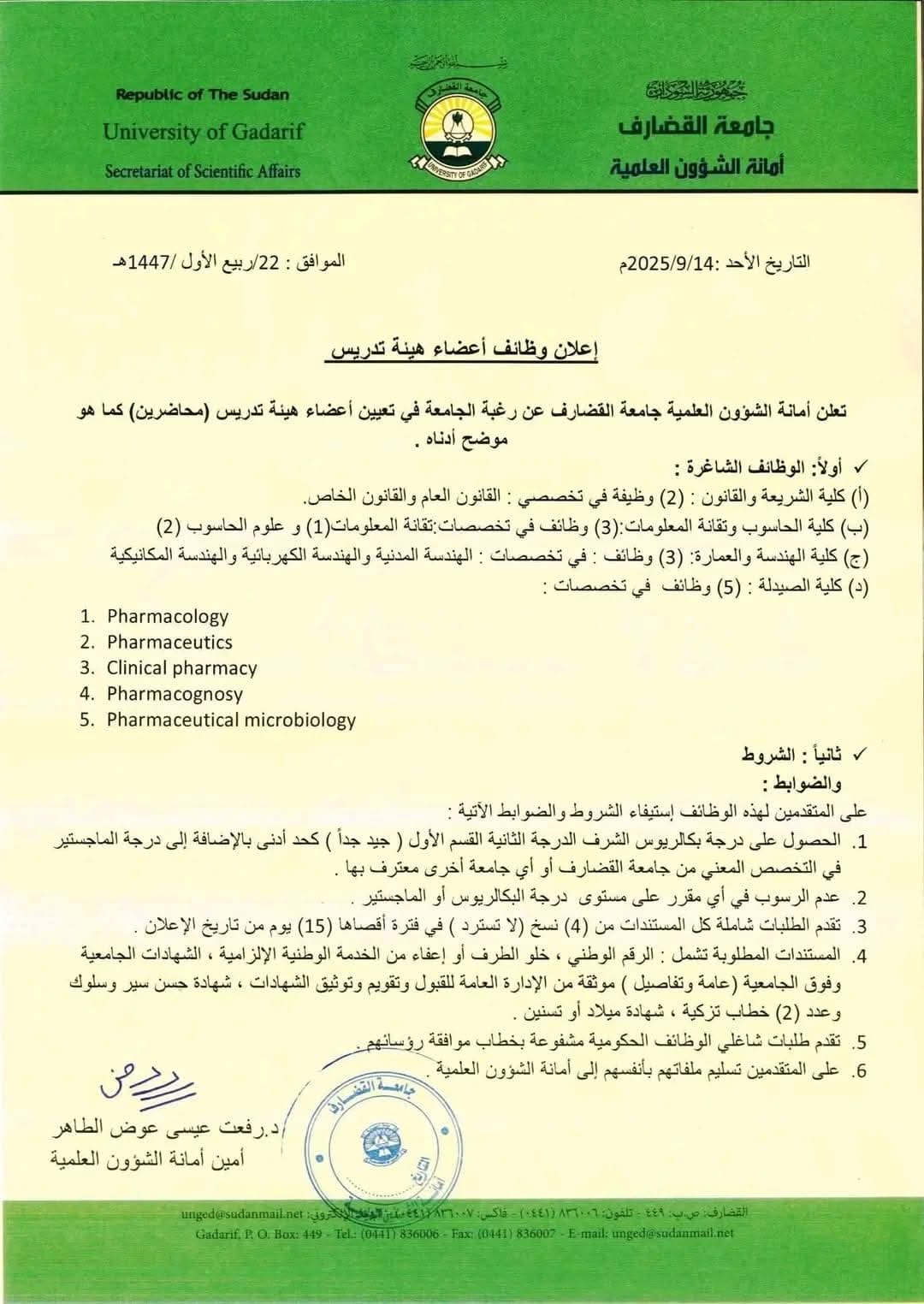 القضارف _ التعليم _ الحكومي ، أعلنت أمانة الشؤون العلمية بجامعة القضارف في 14 سبتمبر 2025 عن فتح باب التقديم لشغل عدد من وظائف أعضاء هيئة التدريس في كليات متعددة بالجامعة، في إعلان حمل طابع الحاجة المهنية للكوادر الأكاديمية المتخصصة ودعوة صريحة للأساتذة المتمتعين بالكفاءة والخبرة للمساهمة في تطوير العملية التعليمية والبحثية في الولاية. الإعلان لم يأتِ كفقرة إدارية بحتة، بل كنداء لإعادة بناء الجسور بين الجامعة والمجتمع المحلي عبر تعليم نوعي يعالج احتياجات السوق والعمل ويعزز من قدرات الطلبة الأكاديميين محلياً.