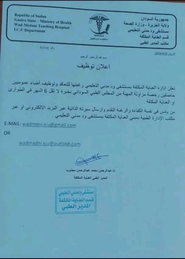مستشفى ود مدني يعلن عن وظائف لأطباء عموميين في قسم العناية المكثفة