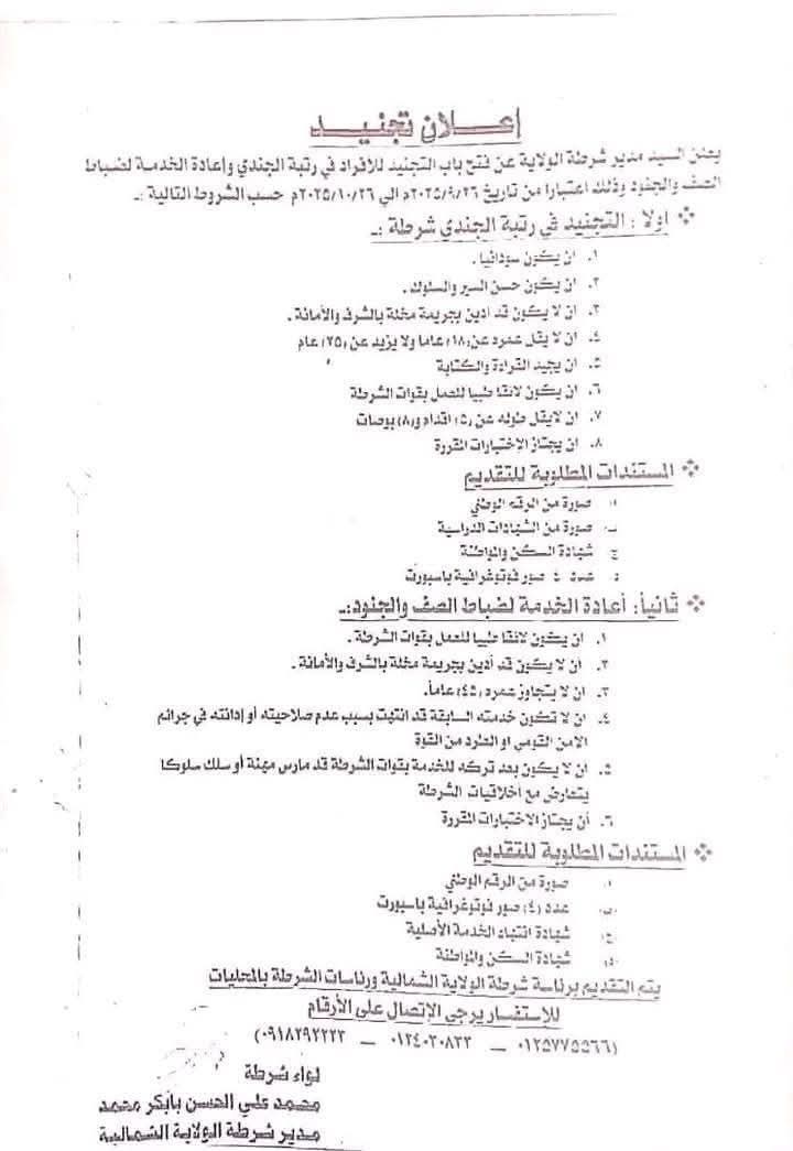 أعلنت شرطة ولاية الشمالية عن فتح باب التجنيد للانضمام إلى صفوفها في رتبة الجندي وإجراءات إعادة الخدمة لضباط الصف والأفراد، في خطوة تهدف إلى تعزيز العناصر البشرية وتحديث الكوادر الأمنية بالمحلية. الإعلان جاء مصحوبًا بالشروط والالتزامات اللازمة لضمان انتقاء المرشحين المؤهلين والقادرين على تحمل متطلبات العمل الشرطي.