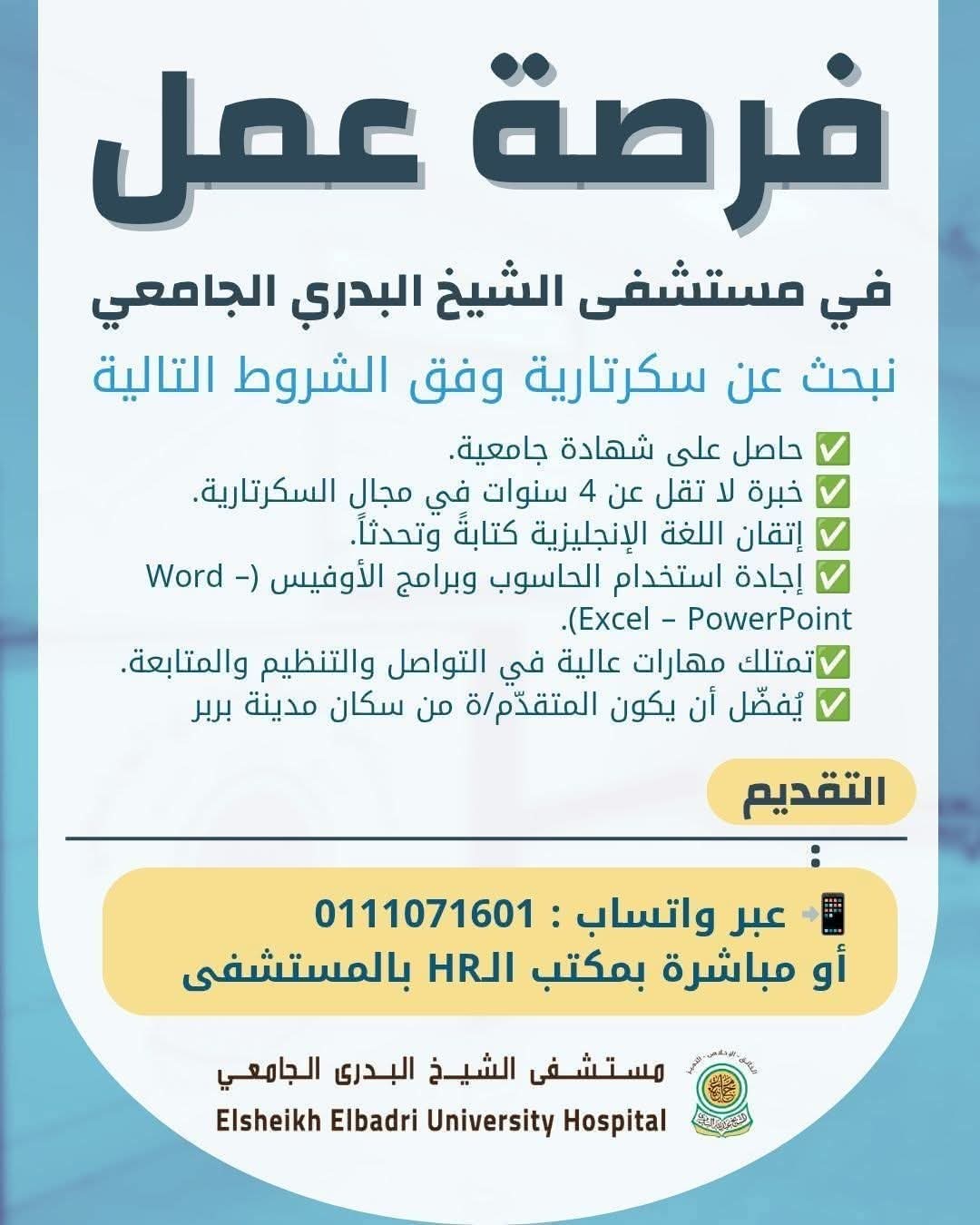 مستشفى الشيخ البدري الجامعي يعلن عن وظيفة سكرتيرة بخبرة لا تقل عن أربع سنوات
