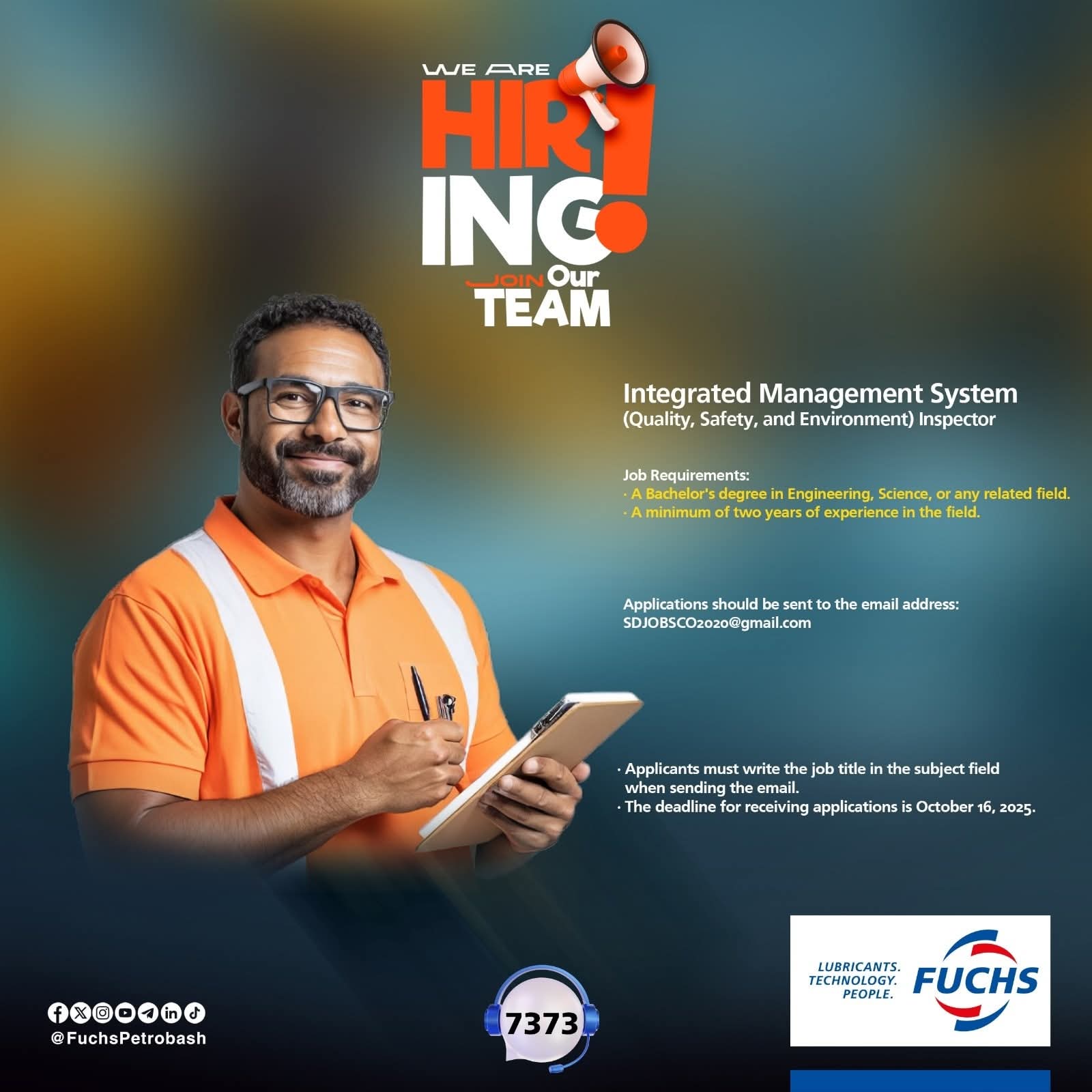 شركة FUCHS تعلن عن وظيفة مفتش نظام الإدارة المتكامل (الجودة والسلامة والبيئة) في السودان