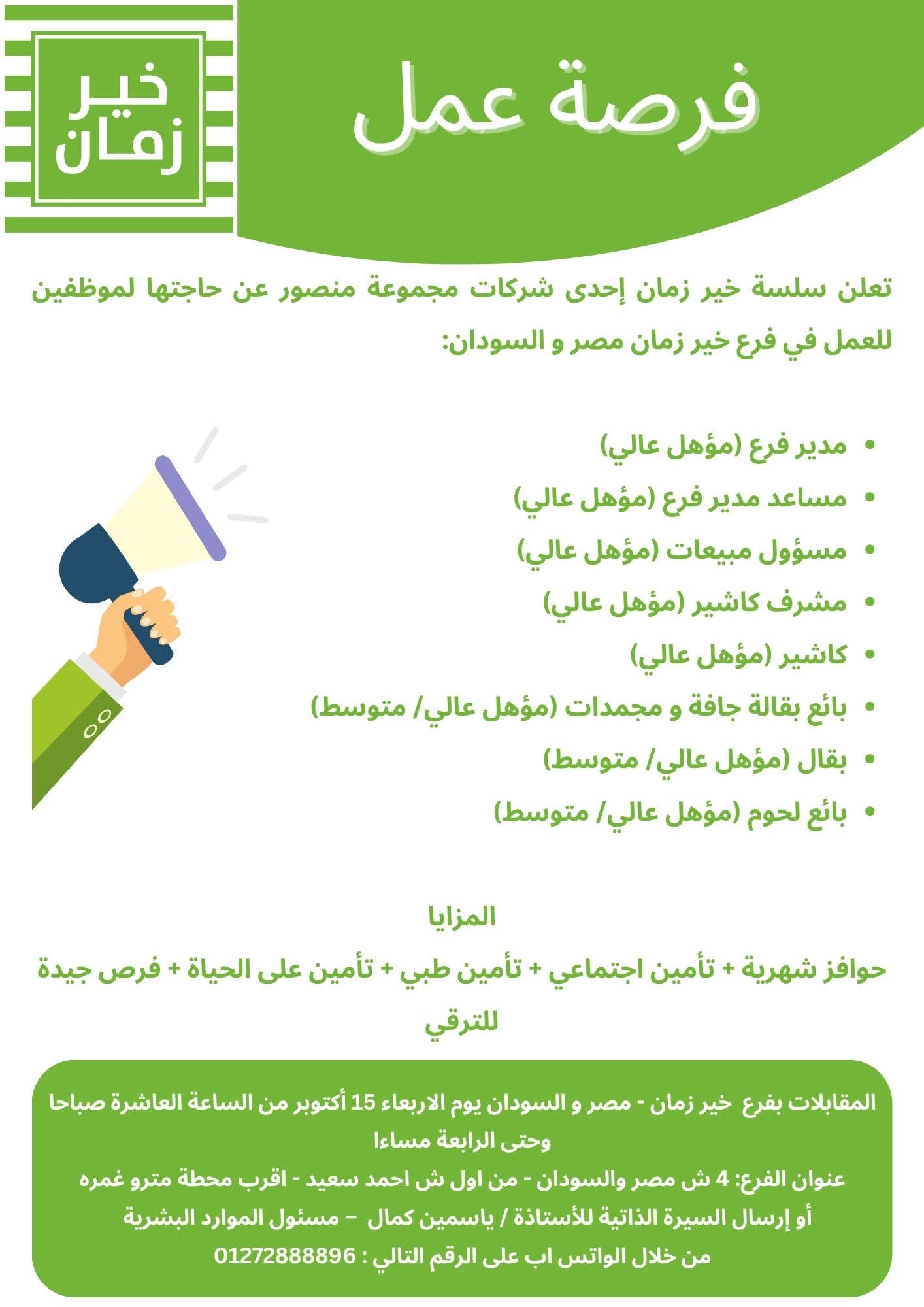 تُعلن سلسلة خير زمان، إحدى الشركات التابعة لمجموعة منصور الرائدة في مجال تجارة التجزئة، عن فتح باب التقديم لعدد من الوظائف للعمل بفرعها الجديد في شارع مصر والسودان. وتأتي هذه الخطوة في إطار سعي الشركة المستمر للتوسع وتوفير فرص عمل للشباب المؤهلين في بيئة عمل مهنية ومستقرة.