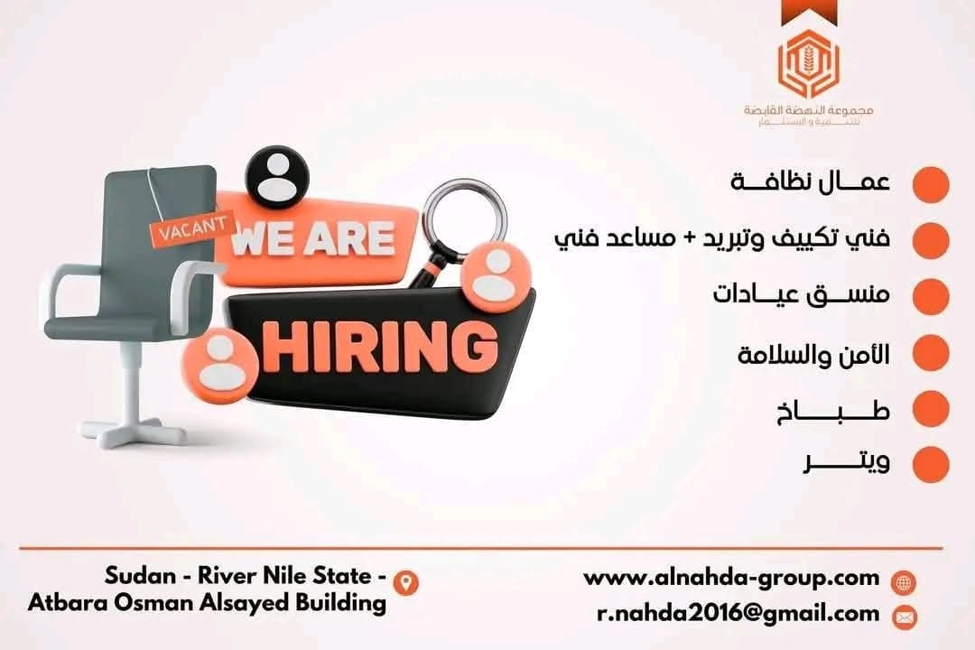 تُعلن مجموعة النهضة للتنمية والاستثمار عن فتح باب التقديم لعدد من الوظائف الشاغرة للعمل في مدينة عطبرة – ولاية نهر النيل، ضمن فريق عمل يسعى لتعزيز جودة الخدمات المقدمة وتنمية قدرات كوادره المهنية.