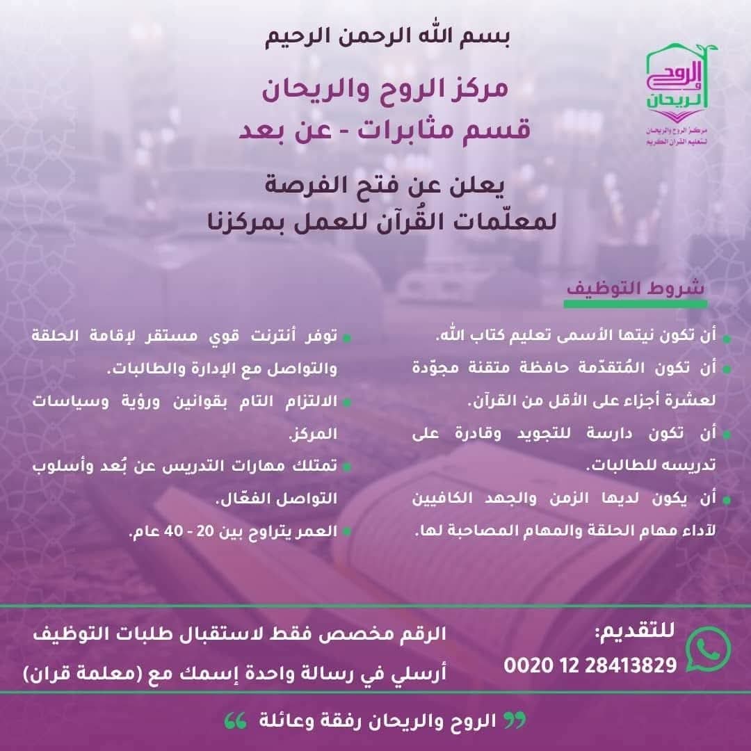 مركز الروح والريحان يعلن عن فرص توظيف لمعلّمات القرآن الكريم عبر الإنترنت