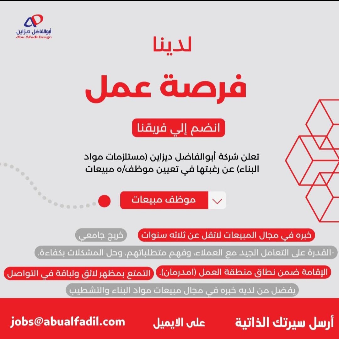 توفر شركة أبوالفاضل ديزاين بيئة عمل محفزة ترتكز على روح الفريق، وتمنح موظفيها فرصًا للنمو المهني والتطور المستمر. ويأتي هذا الإعلان في إطار حرص الشركة على استقطاب العناصر ذات الكفاءة العالية القادرة على المساهمة في تحقيق أهدافها وتقديم تجربة متميزة لعملائها.