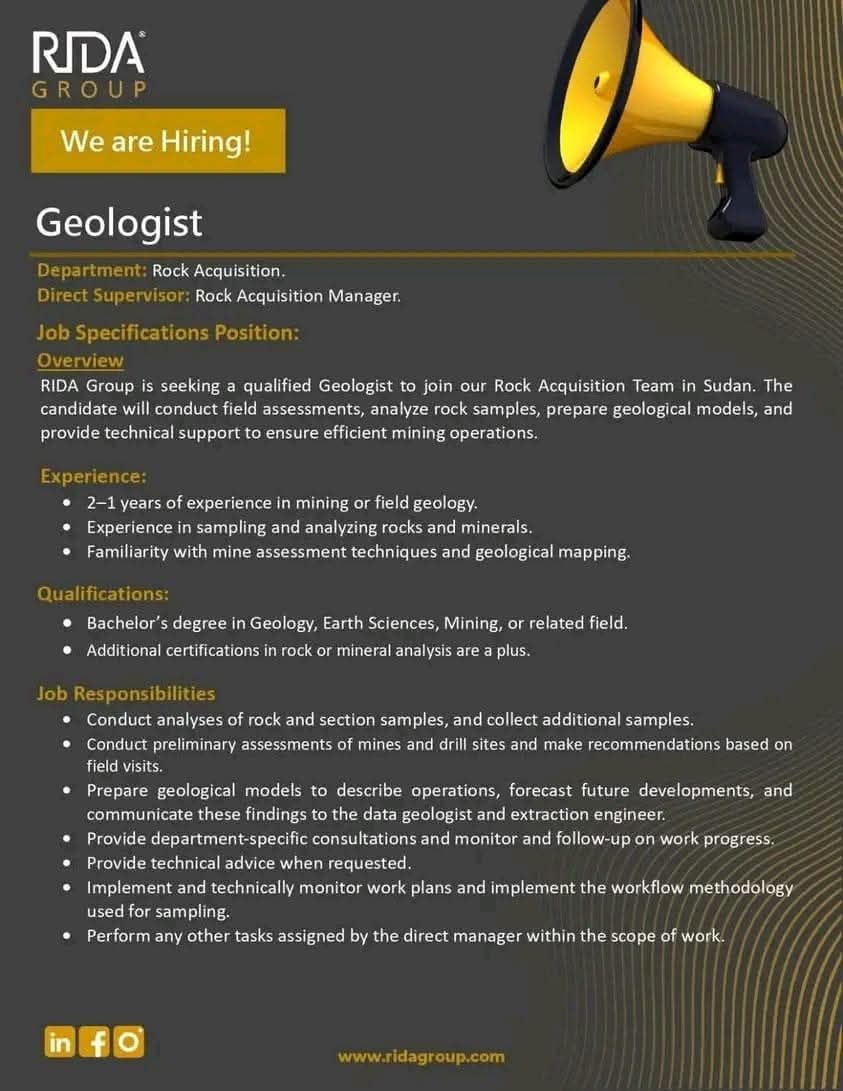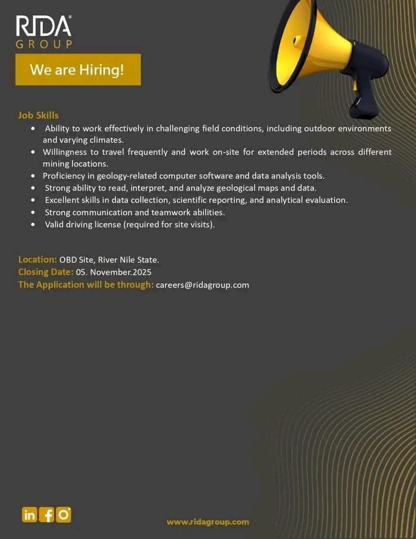 تعلن مجموعة RIDA عن حاجتها لتعيين جيولوجي (Geologist) متمرس للانضمام إلى فريق العمل على موقع OBD بولاية نهر النيل. سيقوم المرشح الناجح بإجراء تقييمات ميدانية، تحليل عينات الصخور، تطوير نماذج جيولوجية، وتقديم الدعم الفني لرفع كفاءة العمليات التعدينية وضمان سير العمل بسلاسة.