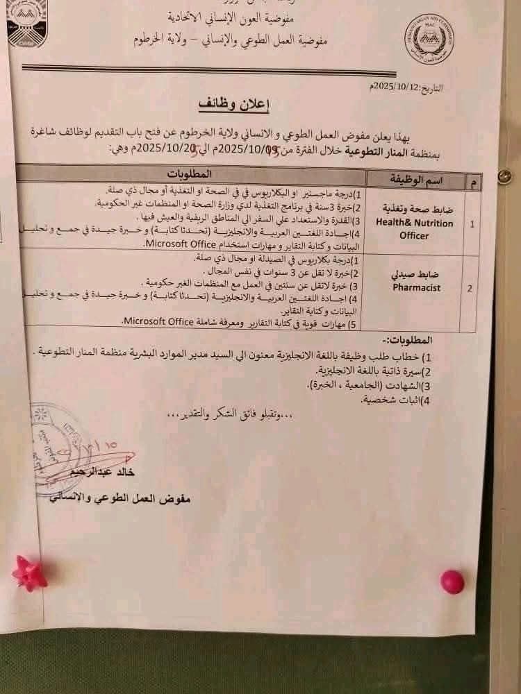 تُعلن مفوضية العمل الطوعي والإنساني – ولاية الخرطوم عن فتح باب التقديم لشغل وظائف شاغرة للعمل مع منظمة المنار التطوعية، وذلك خلال الفترة من 9 أكتوبر 2025م وحتى 20 أكتوبر 2025م، في مقر المفوضية بولاية الخرطوم.