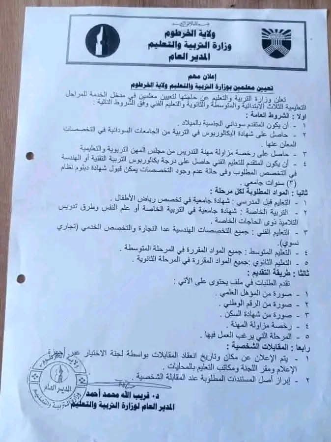 وزارة التربية والتعليم بولاية الخرطوم تعلن عن تعيين معلمين في مختلف المراحل الدراسية