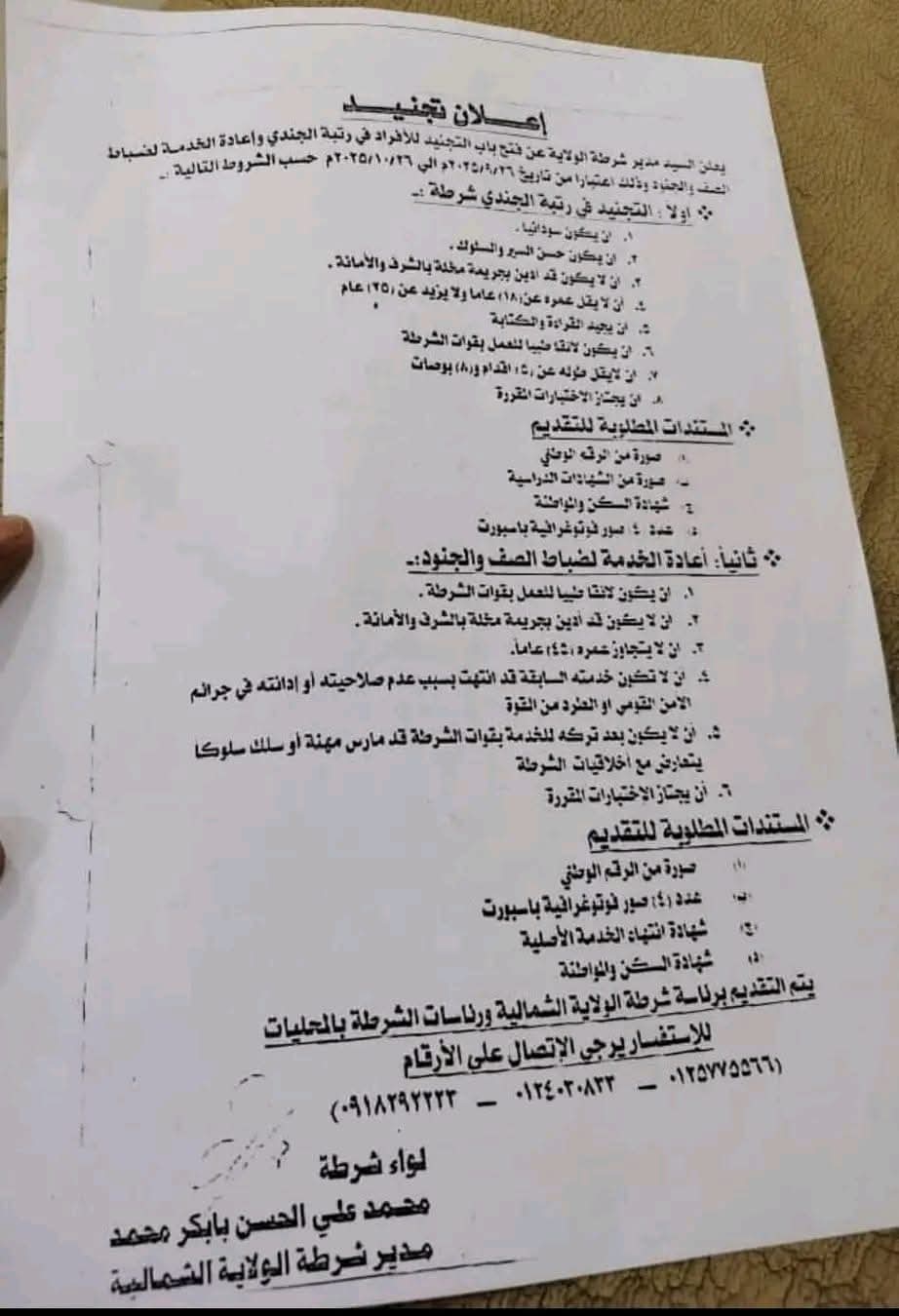 أعلنت مديرية شرطة الولاية الشمالية عن فتح باب التجنيد والالتحاق في رتبة جندي بشرطة الولاية الشمالية، إضافة إلى فتح إجراءات إعادة الخدمة لضباط الصف والجنود اعتباراً من 2025/10/26م وحتى 2025/11/16م، في خطوة تهدف إلى دعم الموارد البشرية للشرطة وتعزيز القدرات الأمنية بالخدمات الميدانية والإدارية.
