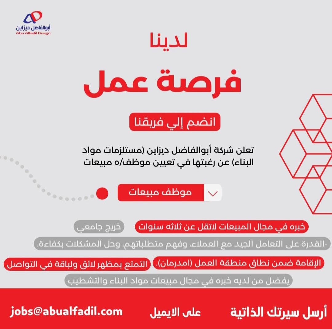 تعلن شركة أبوالفاضل ديزاين – المتخصصة في مستلزمات مواد البناء والتشطيب – عن رغبتها في تعيين موظف/ـة مبيعات معرض للانضمام إلى فريقها بمدينة بورتسودان.