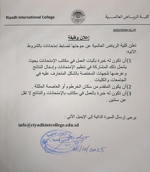 تُعلن كلية الرياض العالمية عن حاجتها إلى ضابط امتحانات للانضمام إلى فريقها الأكاديمي، وفقًا للشروط التالية: