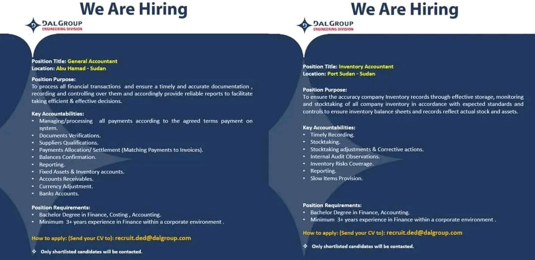 أعلنت مجموعة دال الهندسية عن توفر فرصتي عمل مميزتين في مجالي المحاسبة، بكل من أبو حمد وبورتسودان، ضمن سعي المجموعة لتعزيز كوادرها المهنية ودعم عملياتها في مختلف فروعها داخل السودان.
