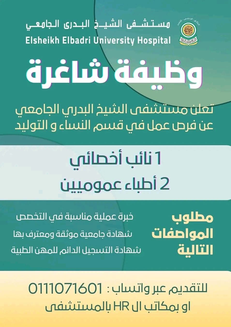 إعلان وظائف بمستشفى الشيخ عبد الله البدري الجامعي – بربر