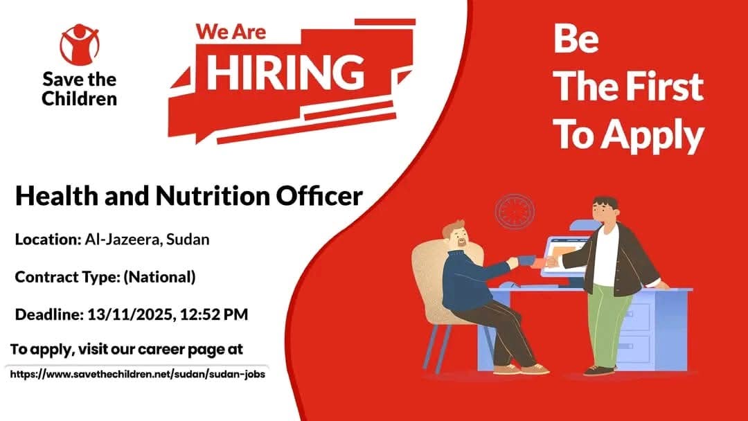 تبحث منظمة Save the Children عن موظف للصحة والتغذية للانضمام إلى فريقها في ولاية الجزيرة بالسودان، في دور إنساني حيوي يركز على تحسين صحة الأطفال ودعم أنظمة التغذية المجتمعية في بيئات تحتاج إلى استجابة سريعة ومدروسة.