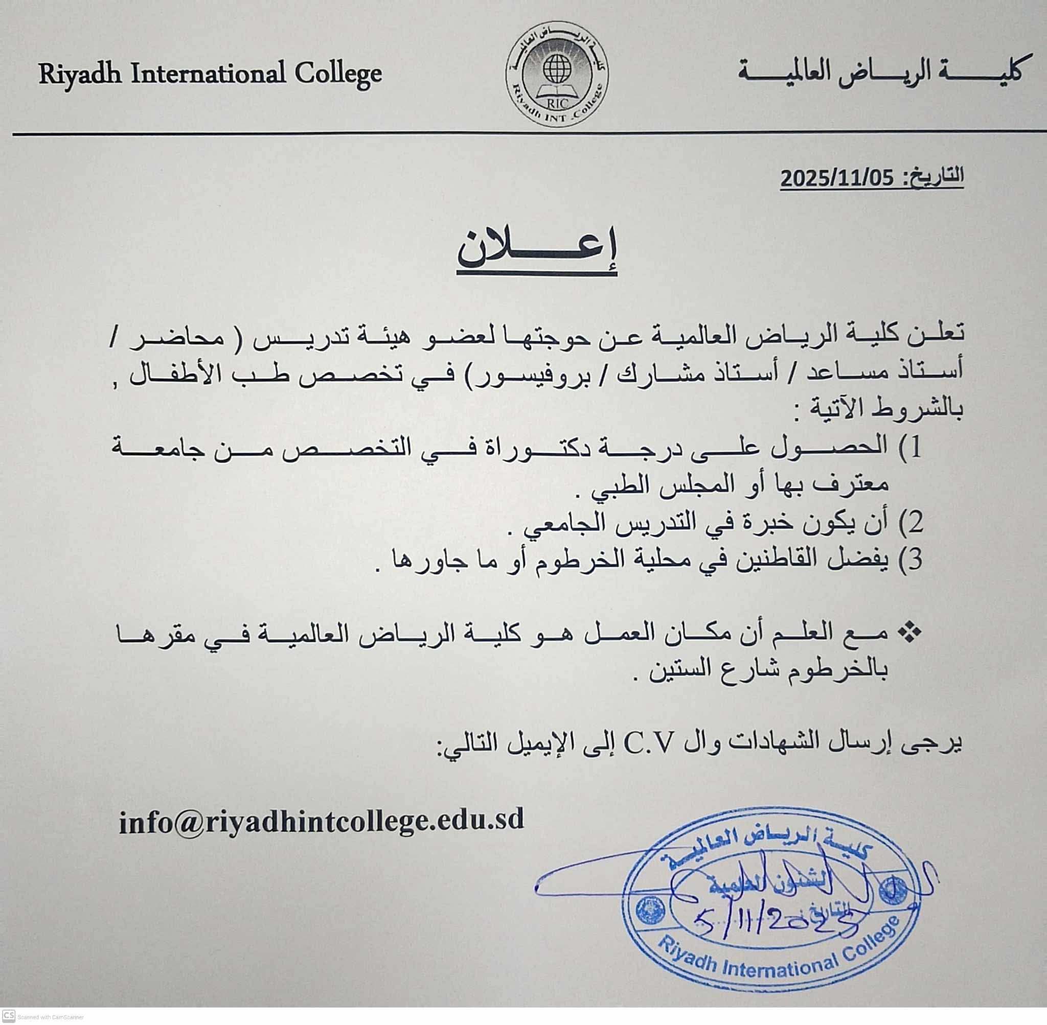 للتقديم أرسل الشهادات والسيرة الذاتية إلى: info@riyadhintcollege.edu.sd