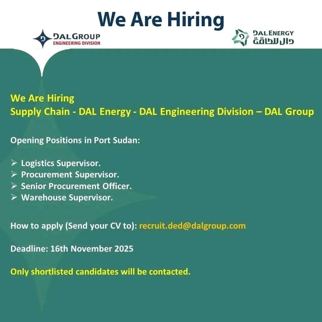 تواصل مجموعة دال للطاقة ضمن قسمها الهندسي التابع لمجموعة دال جهودها في توسيع كوادرها المهنية من خلال الإعلان عن عدد من الوظائف الحيوية في مجال سلسلة الإمداد بمدينة بورتسودان، في خطوة تعكس التزام المجموعة بتعزيز قدراتها التشغيلية واستقطاب الكفاءات الوطنية المؤهلة.