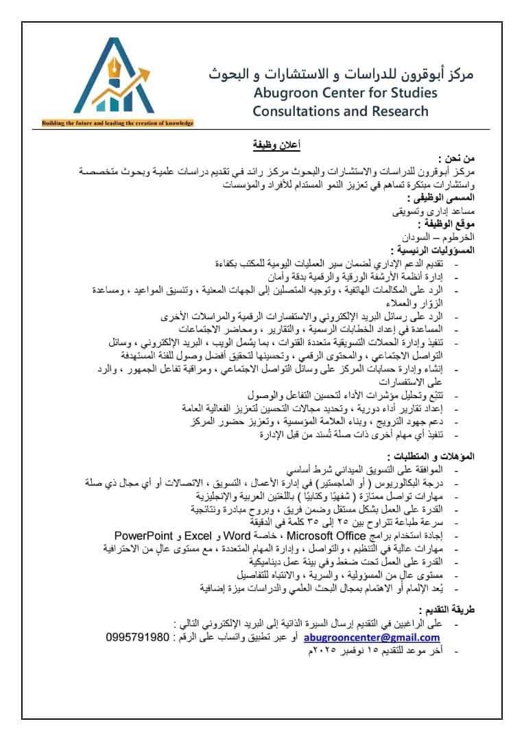 يعلن مركز أبوقرون للدراسات والاستشارات والبحوث عن حاجته لشغل وظيفة مساعد إداري وتسويقي للعمل بمقره في الخرطوم. الإعلان يأتي في وقت تزداد فيه حاجة المؤسسات البحثية إلى كوادر قادرة على الجمع بين التنظيم الإداري والحضور التسويقي لرفع مستوى التواصل مع الجمهور والشركاء.