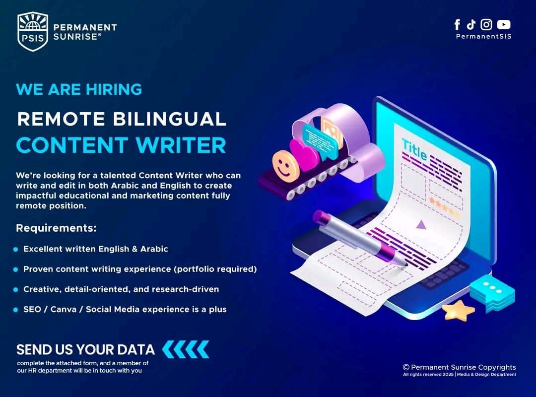 تعلن مدارس صن رايز الدولية (PSIS) عن فرصة عمل مميزة بوظيفة كاتب محتوى ثنائي اللغة (عربي – إنجليزي)، للعمل عن بُعد بشكل كامل، ضمن فريق يسعى لتطوير المحتوى التعليمي والتسويقي بطريقة مبتكرة ومؤثرة.