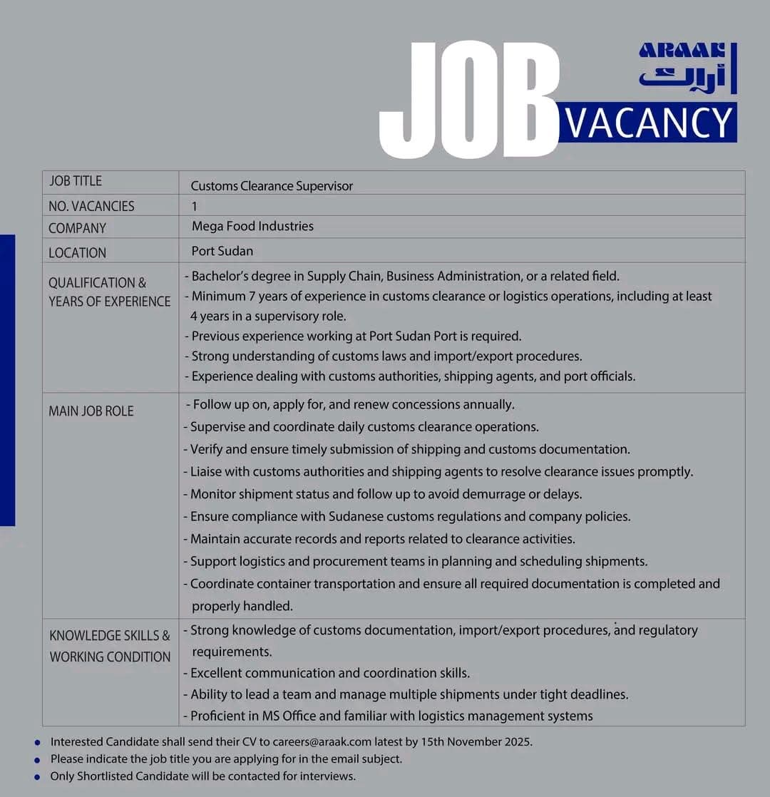 للمهتمين بالتقديم: يرجى إرسال السيرة الذاتية إلى البريد الإلكتروني careers@araak.com قبل تاريخ الإغلاق 15/11/2025. الرجاء كتابة مسمى الوظيفة Customs Clearance Supervisor في خانة موضوع البريد. سيتم التواصل مع المرشحين المدرجين في القائمة المختصرة فقط.