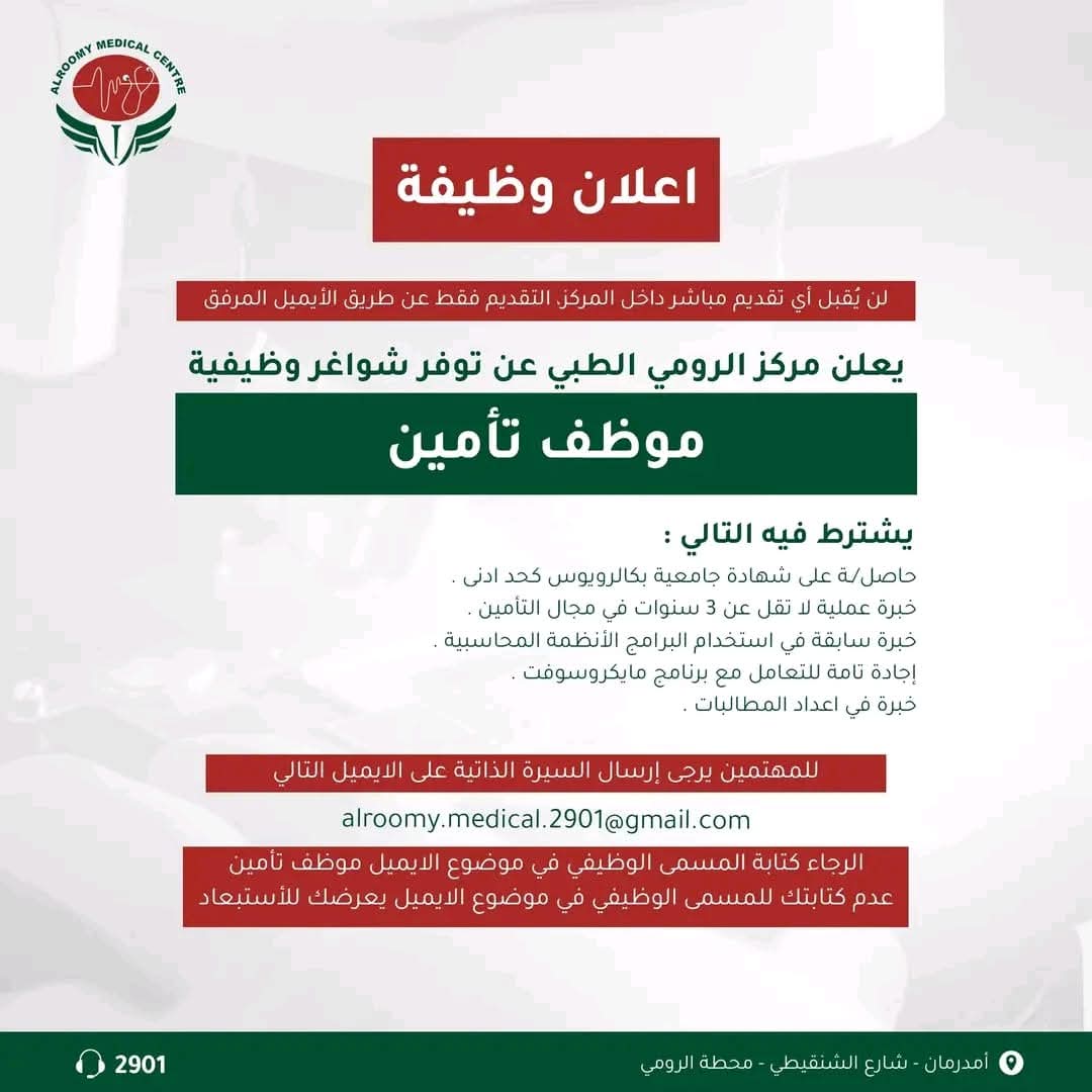 فرصة عمل بمركز الرومي الطبي: وظيفة موظف تأمين بخبرة في المجال