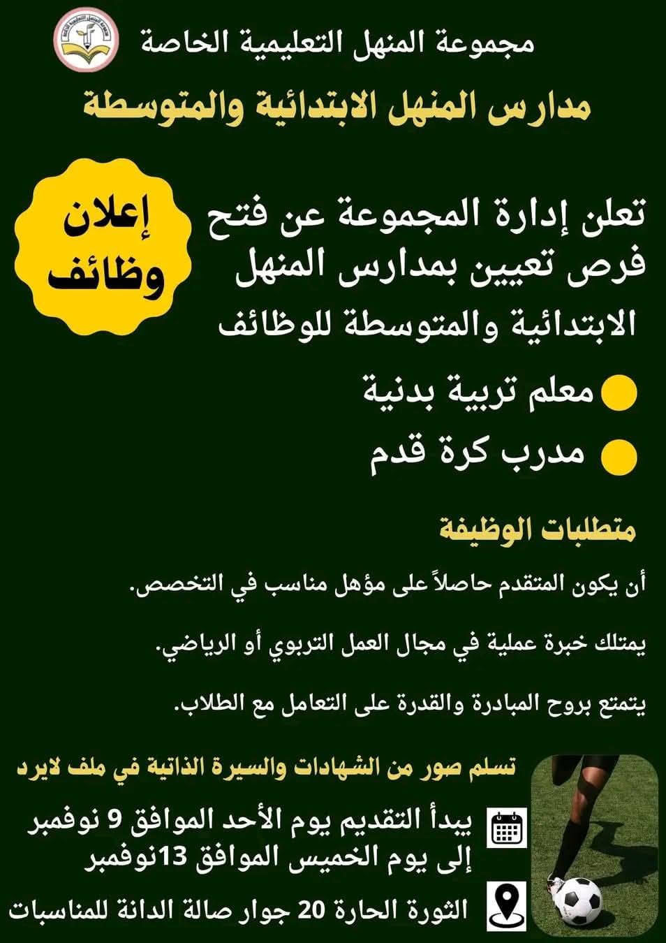 مجموعة المنهل التعليمية تعلن عن وظائف لمعلمي التربية البدنية ومدربي كرة القدم