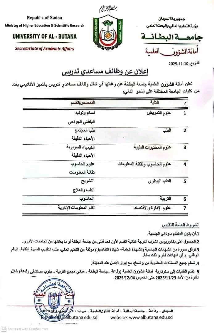 جامعة البطانة تعلن عن وظائف لمساعدي هيئة التدريس بعدة كليات