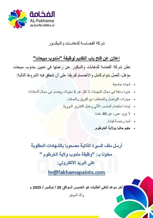 تعلن شركة الفخامة للدهانات والديكور عن فتح باب التقديم لوظيفة مندوب مبيعات للانضمام إلى فريقها المتنامي في ولاية الخرطوم، ضمن خططها لتوسيع نشاطها التجاري وتقديم أفضل الخدمات لعملائها في سوق الدهانات والديكور.