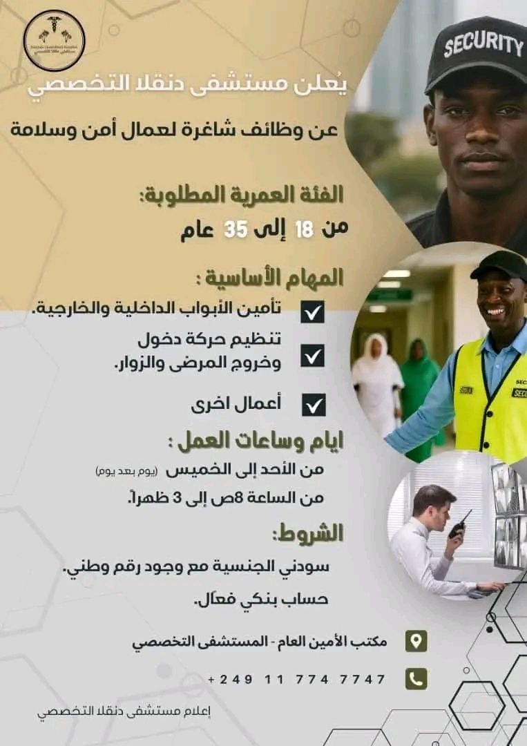 فرصة عمل لعمال أمن وسلامة بمستشفى دنقلا التخصصي
