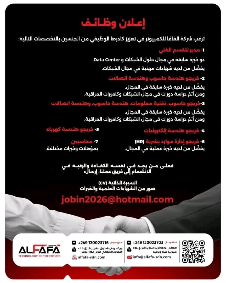 تسعى شركة الفالفا للكمبيوتر إلى توسيع فريقها المهني واستقطاب كفاءات جديدة من الجنسين للانضمام إلى بيئة عمل احترافية تسهم في تطوير مهارات الشباب ودعم قطاع التقنية داخل السودان. وتأتي هذه الخطوة ضمن خطط الشركة لتعزيز خدماتها الفنية والإدارية ومواكبة التوسع المتزايد في مجالات الشبكات، مراكز البيانات، الأنظمة التقنية، والحلول الرقمية.