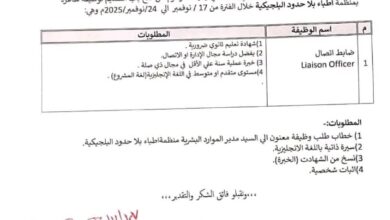 فعلى الراغبين ممن يجدون في أنفسهم الكفاءة إرسال السيرة الذاتية وصور الشهادات العلمية والخبرات إلى البريد الإلكتروني التالي: jobin2026@hotmail.com