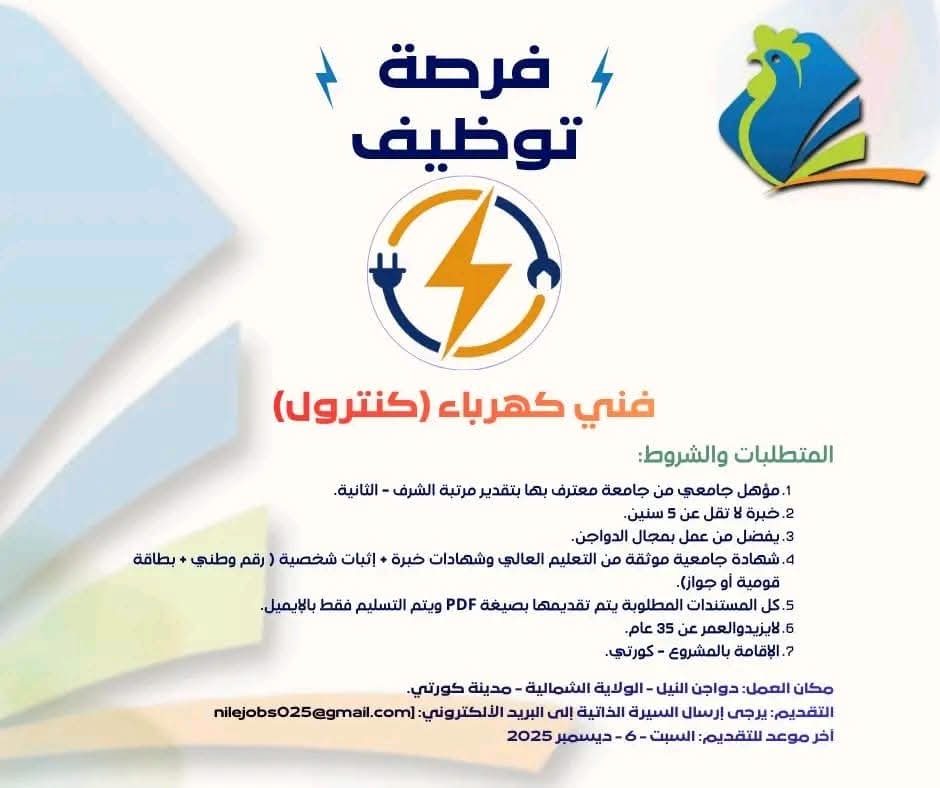 فرصة مميزة للعمل في مجال الكهرباء الصناعية بمشروع دواجن النيل – كورتي شمال السودان