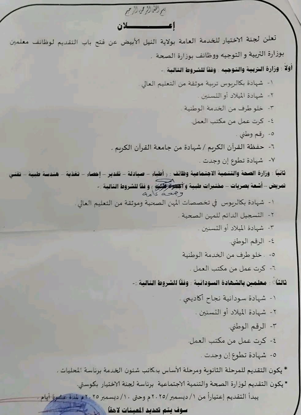 تعلن لجنة الاختيار للخدمة العامة بولاية النيل الأبيض عن بدء التقديم لوظائف معلمين بوزارة التربية والتوجيه ووظائف بوزارة الصحة، وذلك وفق شروط وضوابط تهدف لاستقطاب الكفاءات المؤهلة والقادرة على تقديم خدمة تعليمية وصحية تواكب احتياجات الولاية والمجتمع. يأتي هذا الإعلان في ظل سعي الجهات الحكومية لتعزيز المؤسسات الحيوية بخبرات جديدة، ودعم فرص العمل للخريجين في مختلف التخصصات داخل الولاية.