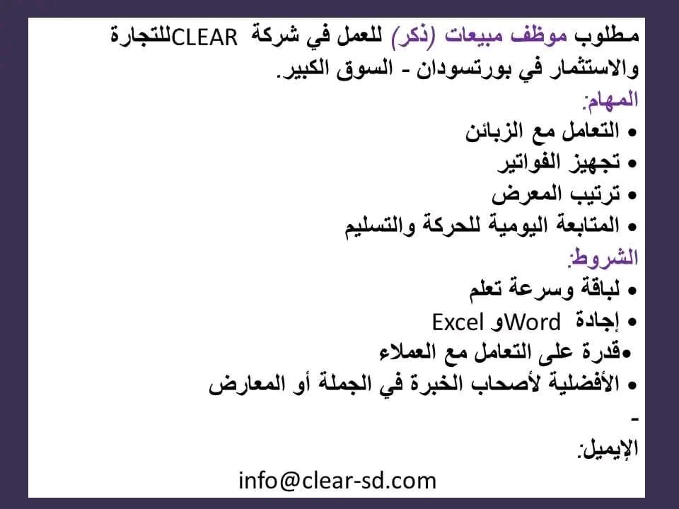 للتقديم: أرسل السيرة الذاتية إلى الإيميل التالي info@clear-sd.com