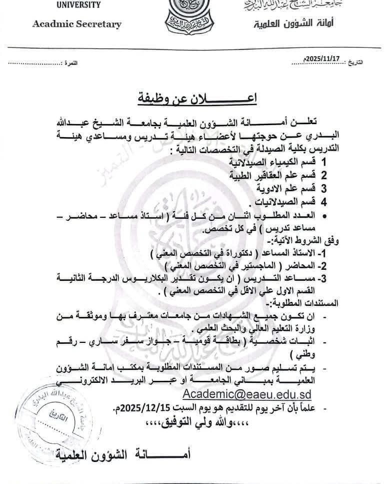 جامعة الشيخ عبدالله البدري تفتح باب التقديم لأعضاء هيئة التدريس بكلية الصيدلة