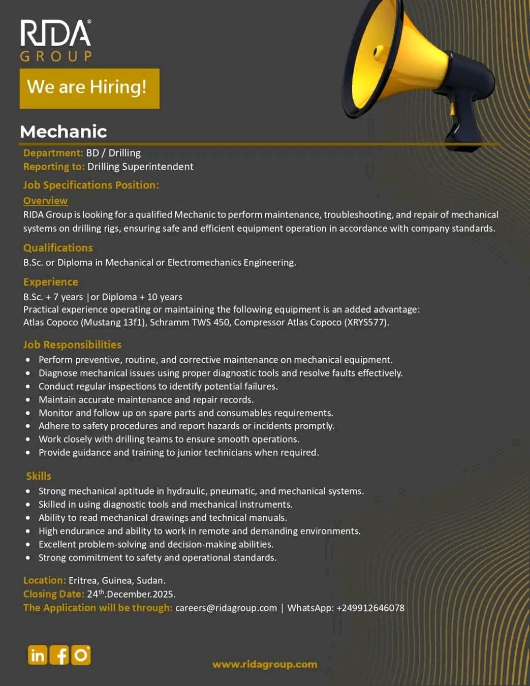 موقع العمل في إريتريا، وآخر يوم للتقديم هو 24 ديسمبر 2025. يمكن التقديم عبر البريد الإلكتروني careers@ridagroup.com أو عبر الواتساب على الرقم +249912646078.