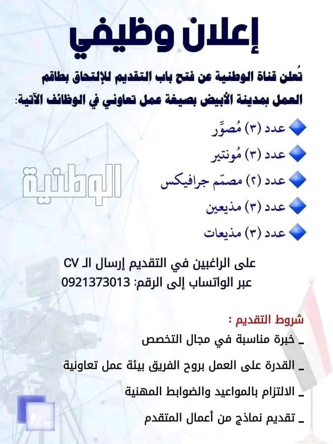 إعلان توظيف بقناة الوطنية للعمل بمدينة الأبيض