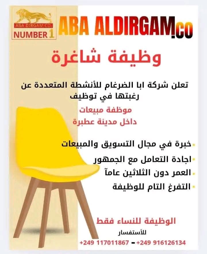 وظيفة شاغرة لموظفة مبيعات لدى شركة أبا الضرغام بمدينة عطبرة