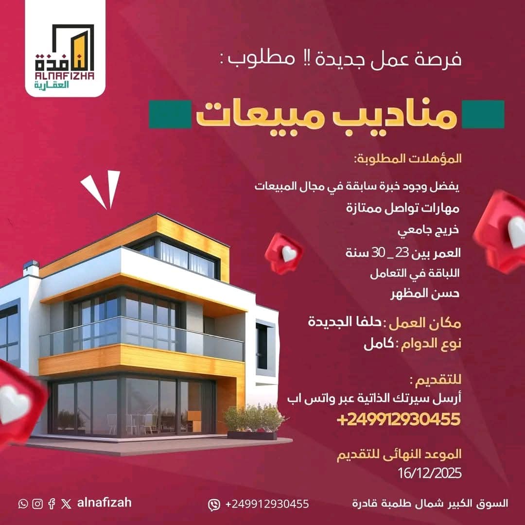 النافذة العقارية تعلن عن فرص عمل لمناديب مبيعات في حلفا الجديدة