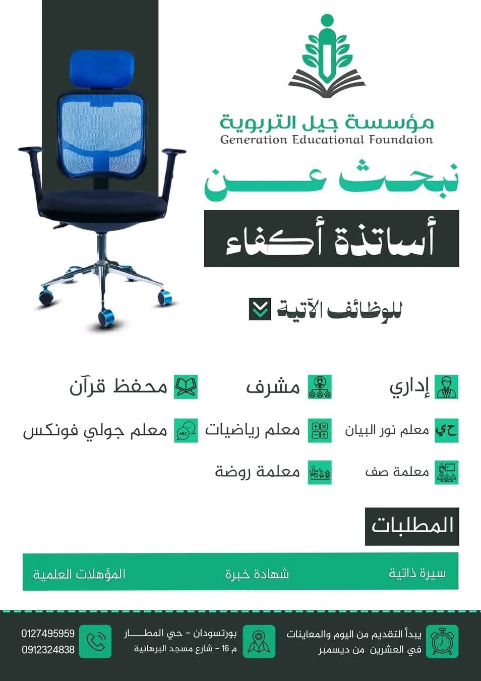 مؤسسة جيل التربوية تعلن فتح باب التوظيف لعدد من التخصصات التعليمية والتربوية ببورتسودان