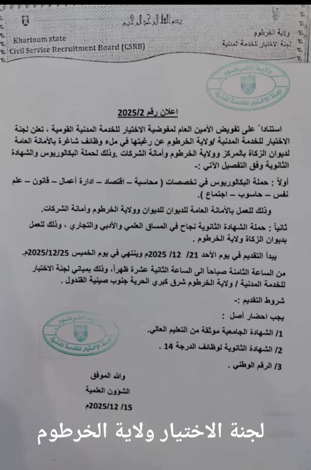لجنة الاختيار للخدمة المدنية بولاية الخرطوم تعلن عن وظائف شاغرة بديوان الزكاة